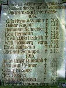 Denkmal für die Gefallenen des Ersten Weltkriegs der ehemaligen Gemeinde Pilgramsdorf-Neuwiesen auf dem Friedhof, nahe der Kirche: Abgestufte Stele mit Reliefs von Stahlhelm und Schwert (früher gekrönt von einem großen Adler).