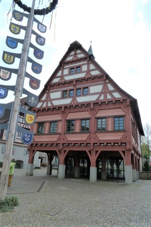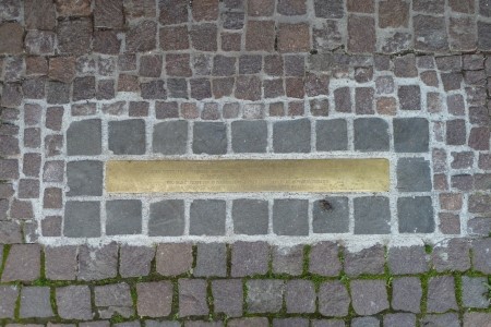 Eine im Frühjahr 2023 durch den Künstler Gunter Demnig verlegte Stolperschwelle am Alten Rathaus zum Gedenken an die Zwangsarbeiterinnen und Zwangsarbeiter