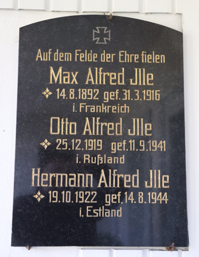 Gedenktafel für drei in den Weltkriegen gefallene Angehörige an der Familiengrabstätte Ille auf dem Friedhof Pöllwitz.