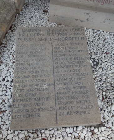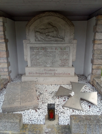 An der Rückwand, unter dem Relief eines Gefallenen, über den sich Christus beugt, eine gerahmte Inschriftentafel mit den Namen der Gefallenen beider Weltkriege auf einem Stufensockel. Davor liegend eine Steintafel mit den Namen der Gefallenen (ohne Vermisste) von Pusselsheim und der Nachbargemeinde Dürrfeld. Daneben ein Eisernes Kreuz aus Metall.