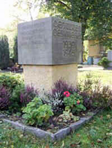 Eine Sandsteinsäule mit aufgesetztem Steinquader kennzeichnet die Kriegsgräber von neun Soldaten. Einer blieb unbekannt..