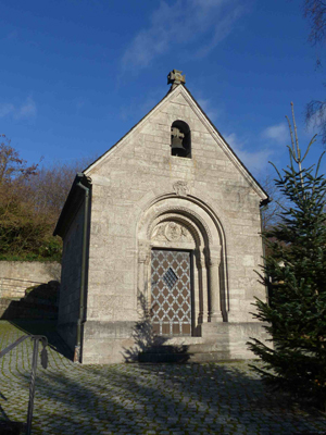 In der Mitte des Friedhofes befindet sich eine kleine Kapelle (abgeschlossen). Darin sind links und rechts Namenstafeln aus Stein angebracht.