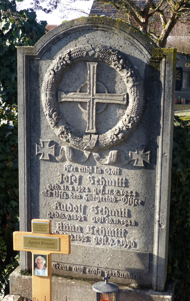 Gefreiter | SCHMACHTENBERGER | Ph. Adolf | 13.12.1889 Randersacker | 27.03.1916 zu Bois des Fresnes b. Verdun | 4. Res. Inf. Regt. 15. Komp. | Inh. d. EK II Kriegsgräberstätte in Hautecourt-lès-Broville: Kameradengrab |