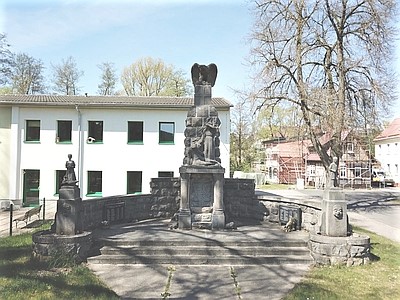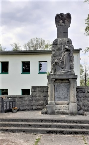 Das Denkmal wurde 1923 und nach Restaurierung 2012 erneut eingeweiht. Dafür hatte sich der Ortsteilrat und viele Bürger und Unternehmer stark gemacht und Spenden, Daten etc. gesammelt. Das Denkmal konnte mit einer Festveranstaltung zum 100. Jahrestag des Beginns des Ersten Weltkrieges restauriert an die Einwohner übergeben werden. Für den kleinen Ortsteil, der ehemals selbstständig war, eigentlich eine bombastische Großanlage. Der Römhilder Steinmetz und Bildhauer Karl Kennep hatte es einst geschaffen. Allerlei Mauerwerk, das die eigentliche Stele umgibt. Zum Denkmal führt eine dreistufige Treppe. Auf der Stele hockt ein die Schwingen öffnender Adler. Darunter die figürliche Darstellung eines zusammengesunken sitzenden sterbenden Kriegers, an dessen Seite die trauernde Witwe in antiker Kleidung steht. Der Krieger ist mit einer Uniformjacke bekleidet, auf der Schulterstücken sichtbar sind. Darunter zwischen Halbsäulen an der Vorderseite eine Schrifttafel mit den Namen der Gefallenen und Vermissten des Ortes. An das Denkmal schließt sich seitwärts eine halbrunde Mauer aus Buckelquadern an. Vor dieser stand jeweils an den Seiten eine steinerne Bank. Heute sind an der Mauer links und rechts im Jahr 2014 zwei Tafeln mit den Namen der Opfer des Zweiten Weltkrieges beigefügt. Ursprünglich befanden sich an den Endpunkten der Mauer jeweils eine Figur, die links eine Frau und rechts einen Soldaten mit Helm und Gewehr darstellten. Die Soldatenfigur rechts wurde umgestaltet. Helm und Gewehr wurden entfernt. Die Figur ähnelt jetzt eher einem Kind. Sie befanden sich jeweils auf einer Stele, die an der Vorderseite einen Wasser speienden Kopf hatte. Davor ein Wasserbecken. Diese wurden nicht wieder in Gang gebracht.