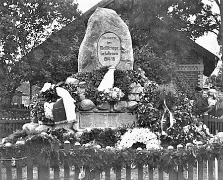 Ehemaliges Denkmal für die Gefallenen des Ersten Weltkriegs: Feldsteinhaufen mit angebrachter Namenstafel, darauf Findling mit Widmungstafel. Das Denkmal wurde nach 1945 zerstört und die Namenstafel eingelagert.