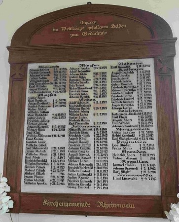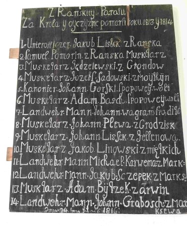 Nach 1945 wurde in Ostpreußen die deutsche Bevölkerung vertrieben und die meisten Denkmäler abgerissen, beschädigt oder umgewidmet. Hier hängen die Gedenktafeln noch an ihren alten Stellen in der Kirche. Die Gedenktafel des Krieges 1813-1815 ist aber sehr außergewöhnlich, da die Widmung oben und die Ortsnamen in Polnisch geschrieben sind. Die Dienstgrade sind eine Mischung aus Deutsch und Polnisch. Wahrscheinlich ist die Original-Tafel zerrstört worden oder zerfallen und es wurde nach 1945 eine neue angefertigt, dann in Polnisch und die Dienstgrade wurden „polnisiert“. Die Wohnorte werden hier in Polnisch beibehalten, da nicht alle deutschen Bezeichnungen der angegebenen Ortsnamen gefunden wurden.