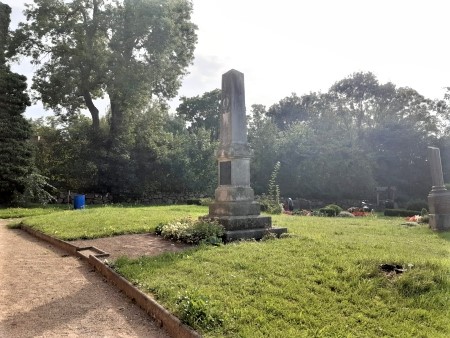 Stele auf dem Friedhof. Die Rückseite der Stele ist mit einem plattdeutschen Spruch verziert.