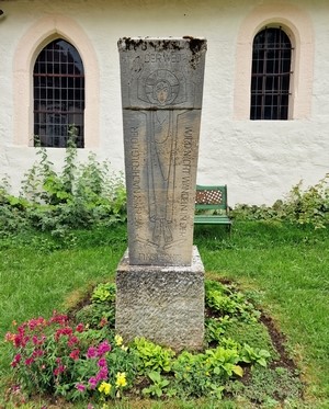 Einfache Stele auf quaderförmigen Grundstein vor dem Seiteneingang zur Kirche auf dem Kirchhof an der Südseite. Auf der Vorderseite die stilisierte Darstellung von Jesus mit erhobenen segnenden Händen. Christus steht auf einem zerbrochenem Seitengewehr. An den Seiten Inschriften in Arial-Form.