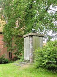 Links neben der Matthäus-Kirche steht ein viereckiges Steindenkmal, oben eine Kugel.