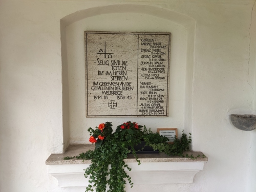 Eine Steinplatte im offenen Eingangsbereich der katholischen Filialkirche St. Margareth. Links oben ein eingelassenes Kreuz mit A (Alpha) und Ω (Omega), unten ein offenes Eisernes Kreuz.