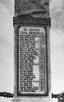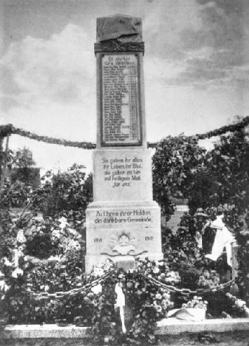 Ehemaliges Denkmal für die Gefallenen des Ersten Weltkriegs: Abgestufte Stele mit EK-Zeichen im Ehrenkranz und den Widmungen im unteren Bereich, eingelassener Namenstafel in der Mitte und Stahlhelm-Relief im oberen Bereich.