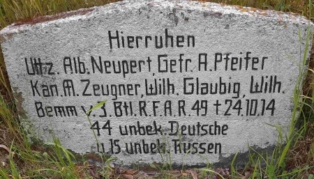 Ergänzende Daten und Namen wurden aus dem Buch von M. Dehnen notiert: Die Kriegsgräber in Ostpreussen von 1914/15.