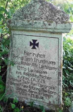 Kriegsgräberstätte für Gefallene des Ersten Weltkriegs weit nordöstlich des Ortes: Sieben Einzelgrabsteine und zwei große Steine für mehrere Gefallene (nur noch einer vorhanden) für insgesamt 30 deutsche und zwei unbekannte russische Soldaten.