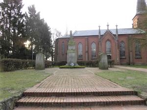 Ein dreiteiliges Steindenkmal vor der Kirche St. Johannis.