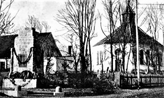 Denkmal für die Gefallenen des Ersten Weltkriegs am Kirchhofzaun: Aus Natursteinen gemauerte breite und abgestufte Stele mit eingelassenen Widmungs- und Namenstafeln (abgerissen).