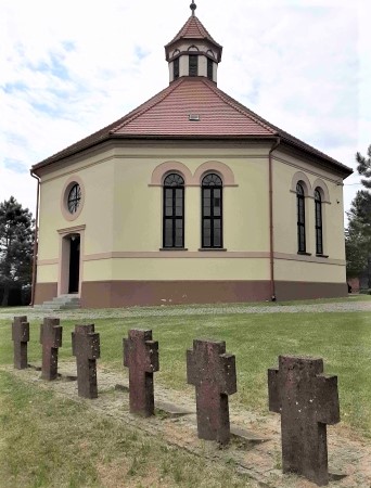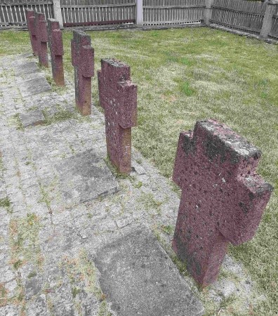 An der Kirche eine Reihe von sechs Grabkreuzen für 15 deutsche und zwei unbekannte russische hier gefallene Soldaten.