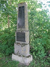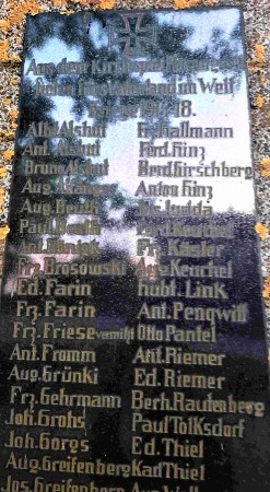 Denkmal für die Gefallenen des Ersten Weltkriegs am Friedhof: Aus Feldsteinen gemauertes Monument mit vorn schwarzer Marmortafel, auf dieser oben ein Eisernes Kreuz, darunter Inschrift, Namen und Widmung.