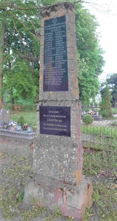 Nach 1945 wurde in Ostpreußen die deutsche Bevölkerung vertrieben und die meisten Denkmäler abgerissen, beschädigt oder umgewidmet. Dieses Denkmal steht als eins der wenigen noch unbeschädigt in seiner ursprünglichen Form. Es könnte aber an der Spitze noch einen Adler oder ein EK-Zeichen getragen haben. Historische Aufnahmen waren nicht auffindbar.