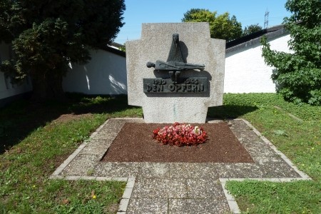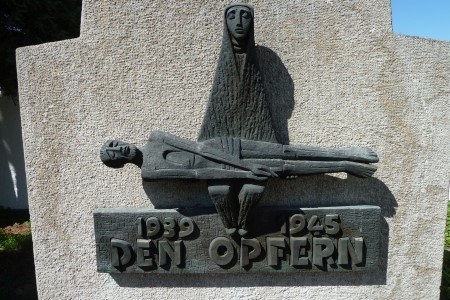 Im Eingangsbereich bei der Aussegnungshalle: Modern gestaltetes Denkmal mit Darstellung der Pietà für die Gefallenen des Zweiten Weltkriegs, ohne Namen.