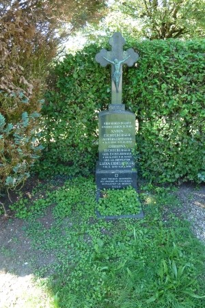 Friedhof: Aufgelassenes Gräberfeld an einer Friedhofsseite. Traditionelles steinernes Ehrenmal mit großem aufgesetztem Eisernen Kreuz für die Gefallenen des Ersten Weltkriegs, ohne Namen.