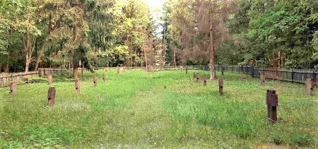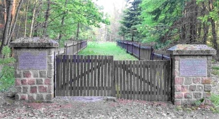 Kriegsgräberstätte für Gefallene des Ersten Weltkriegs im Wald südlich des Ortes: Natursteinpfeiler mit zweisprachigen Inschriften am Eingang zu einer langen rechteckigen Fläche mit Grabkreuzen und abschließendem hohem Holzkreuz.