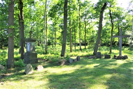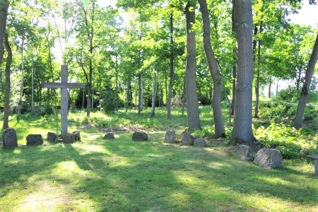 1. Großes Holzkreuz mit einem „Steinkreis“ aus Findlingen mit Namen von Gefallenen des Ersten Weltkriegs (ein Stein mit 7 Namen) und Zweiten Weltkriegs (je Stein ein Name).