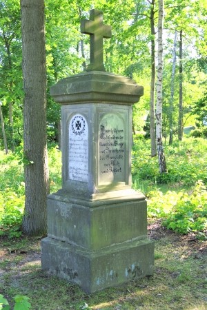 2. Eine längliche viereckige Steinsäule neben dem Steinkreis, ca. 3 Meter hoch mit Kreuz für 10 Gefallene des Krieges 1870/71.