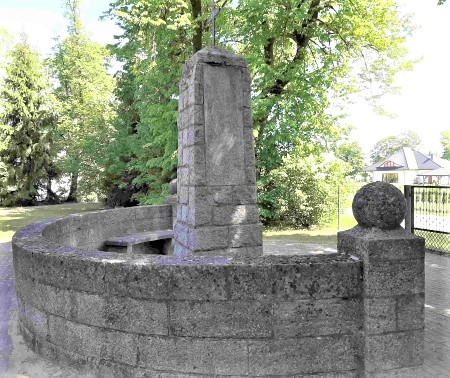 Denkmal für die Gefallenen des Ersten Weltkriegs vor der Kirche: Aus Steinblöcken gemauerter Obelisk mit eingelassenen Widmungs- und Namensflächen, umrandet von einer halbrunden Mauer mit Kugeln auf den Endpfeilern. Es wurden zwei neuere Widmungstafeln in Deutsch und Polnisch angebracht. Das Relief eines Stahlhelms unten wurde herausgemeißelt.