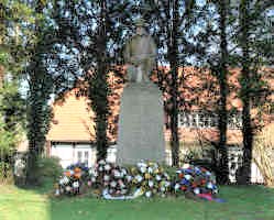 Neben der Kirche im Ort: Auf einem Sockel kniet ein Soldat mit aufgestütztem Gewehr in der Hand.