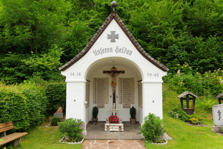 Kapelle neben dem Ortsfriedhof. Vor den Namen jeweils ein Porträt des Gefallenen.