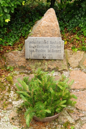 Platte auf einem Feldstein links neben der Kapelle für drei Soldaten, die am 05.05.1945 gefallen sind.