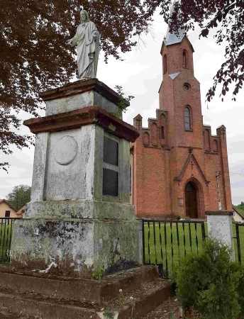 Nach 1945 wurde in Ostpreußen die deutsche Bevölkerung vertrieben und die meisten Denkmäler abgerissen, beschädigt oder umgewidmet. Hier wurden vorn die Widmung und der Ehrenkranz mit Stahlhelm und gekreuzten Schwertern verkleistert und eine Jesus-Statue aufgesetzt. Die Widmung hinten wurde mit Farbe übermalt, ist aber noch lesbar. Das Denkmal bröckelt schon stark und größere heruntergefallene Brocken liegen dahinter (Stand 2023). Lesbare Aufnahmen mit der vorderen Widmung waren nicht auffindbar und werden gesucht.