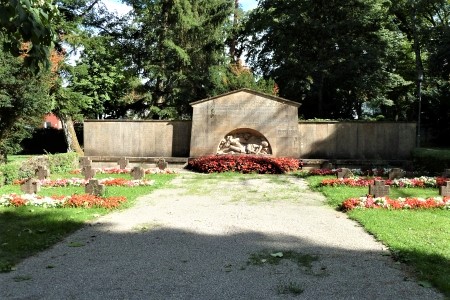 Die Inschriften „1914–1918“ und „1939–1945“ wurden wohl nachträglich angebracht. Vor der Mauer befinden sich 18 Einzelgräber.