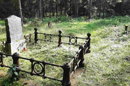 Kleine Kriegsgräberstätte für Gefallene des Ersten Weltkriegs im Wald beim alten Ortsteil Forsthaus: Privater großer Grabstein mit Eisenumrandung und vier Steinkreuze.