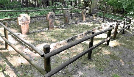 Kriegsgräberstätte für Gefallene des Ersten Weltkriegs auf dem abgelegenen und völlig verwilderten alten evangelischen Friedhof am Seeufer südwestlich des Ortes: Vier Grabsteine in einer Reihe, von einem Holzgatter umrandet.