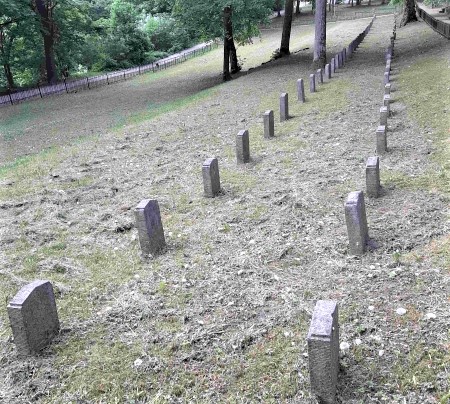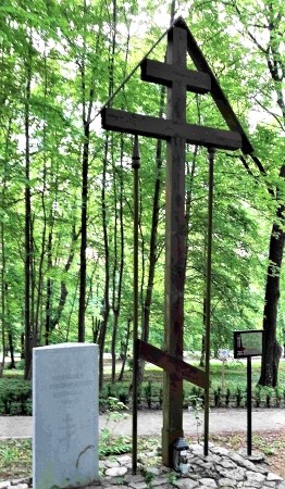In der Nähe, den Hügel hinauf, das Massengrab von russischen Soldaten mit Widmungsstein und orthodoxem Holzkreuz.