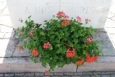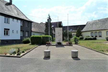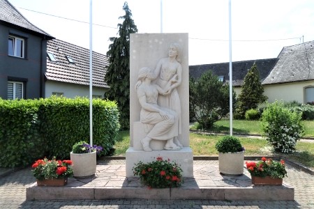 Sehr gepflegtes Kriegerdenkmal in der Ortsmitte gegenüber dem Rathaus: Stele mit der Darstellung zweier (wohl trauernder) Frauen, geschaffen vom Bildhauer René Hetzel (1902 - 1972).