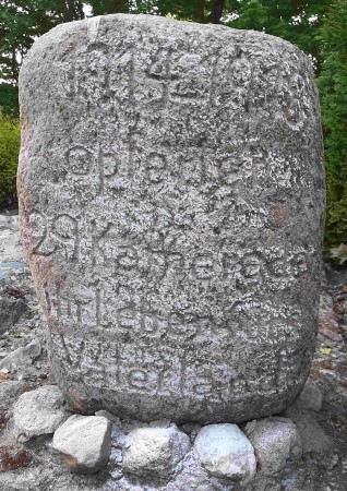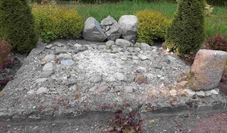 Reste eines Denkmals für die Gefallenen des Ersten Weltkriegs auf dem Gelände des ehemaligen evangelischen Friedhofs in der Mitte des Dorfes: Grundriss aus Feldsteinen und ein Findling mit Widmung.