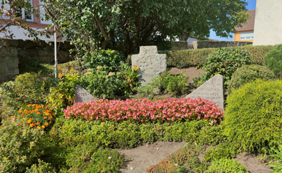 Reich bepflanzte Denkmalstätte bei der Kirche.