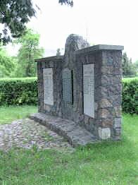 In einer kleinen Anlage ein Findling mit eingesetzter Platte mit den Namen der 15 Kriegstoten des Ersten Weltkrieges.