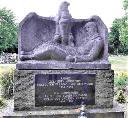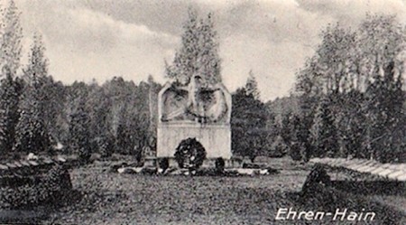 Ehemaliger Ehrenhain für die Gefallenen des Ersten Weltkriegs: Quader mit Widmung und krönender großer Figur eines Adlers, der mit seinen ausgebreiteten Schwingen einen liegenden sterbenden Soldaten beschirmt (noch vorhanden).