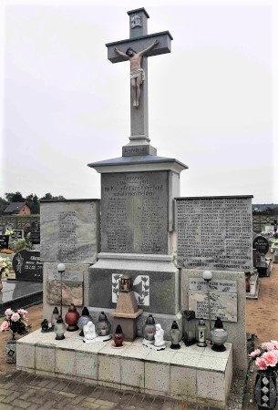 Denkmal errichtet für die Gefallenen des Ersten Weltkriegs: Abgestufte Stele mit aufgesetztem großem Kreuz,