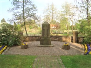 Vor der Mauer 2 aufrechte Steine mit den Namen der 37 Opfer des Zweiten Weltkrieges. Zwischen beiden ein kleinerer Stein mit Inschrift.