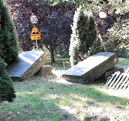 Reste eines Denkmals für Gefallenen des Ersten Weltkriegs: Zwei schräg auf dem Boden abgelegte Namenssteine.