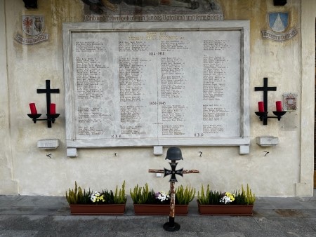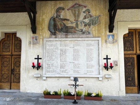 Wandtafel an der kath. Kirche von St. Leonhard im Passeiertal, Südtirol, (Pfarrei zum hl. Leonhard).