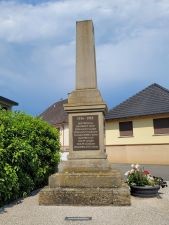 Gepflegt wirkendes mehrstufiges Denkmal in Form eines Obelisken. Die Tafeln enthalten sowohl eine Inschrift als auch die Namen der Toten beider Weltkriege.