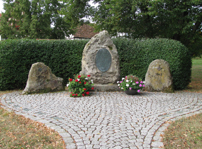 Großer Steinfindling mit einer an der Vorderseite eingepassten, ovalen Metallplatte.