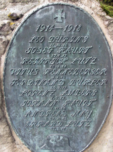 Darauf in erhabener Schrift die Daten der Gefallenen des 1. Weltkrieges. Auf zwei kleineren Findlingen, links und rechts davon,