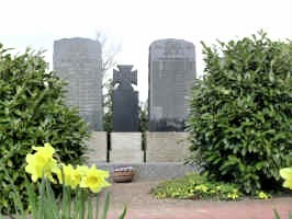 Auf dem Friedhof von Suderbruch zwei schwarze Gedenksteine mit den 12 bzw. 35 Namen der Kriegstoten beider Weltkriege, dazwischen ein Eisernes Kreuz.