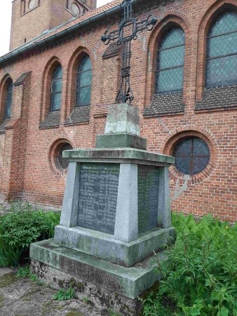 Nach 1945 wurde in Westpreußen die deutsche Bevölkerung vertrieben und die meisten Denkmäler abgerissen, beschädigt oder umgewidmet. Hier wurden Teile oben abgerissen, auf denen die Widmung angebracht war, und ein Kreuz aufgesetzt. Bilder im ursprünglichen Zustand waren nicht auffindbar und werden gesucht.